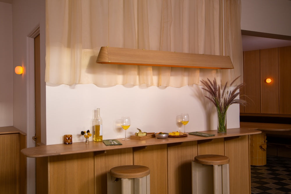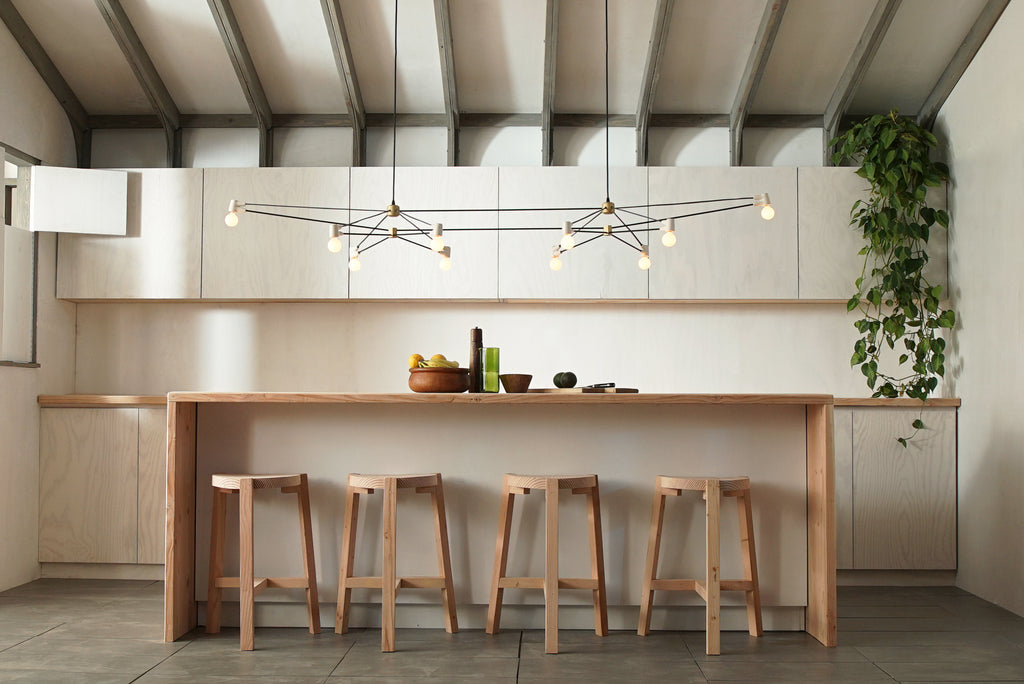 Ten floating bulbs held aloft through a simple armature of cords and rods, for a dramatic finish.