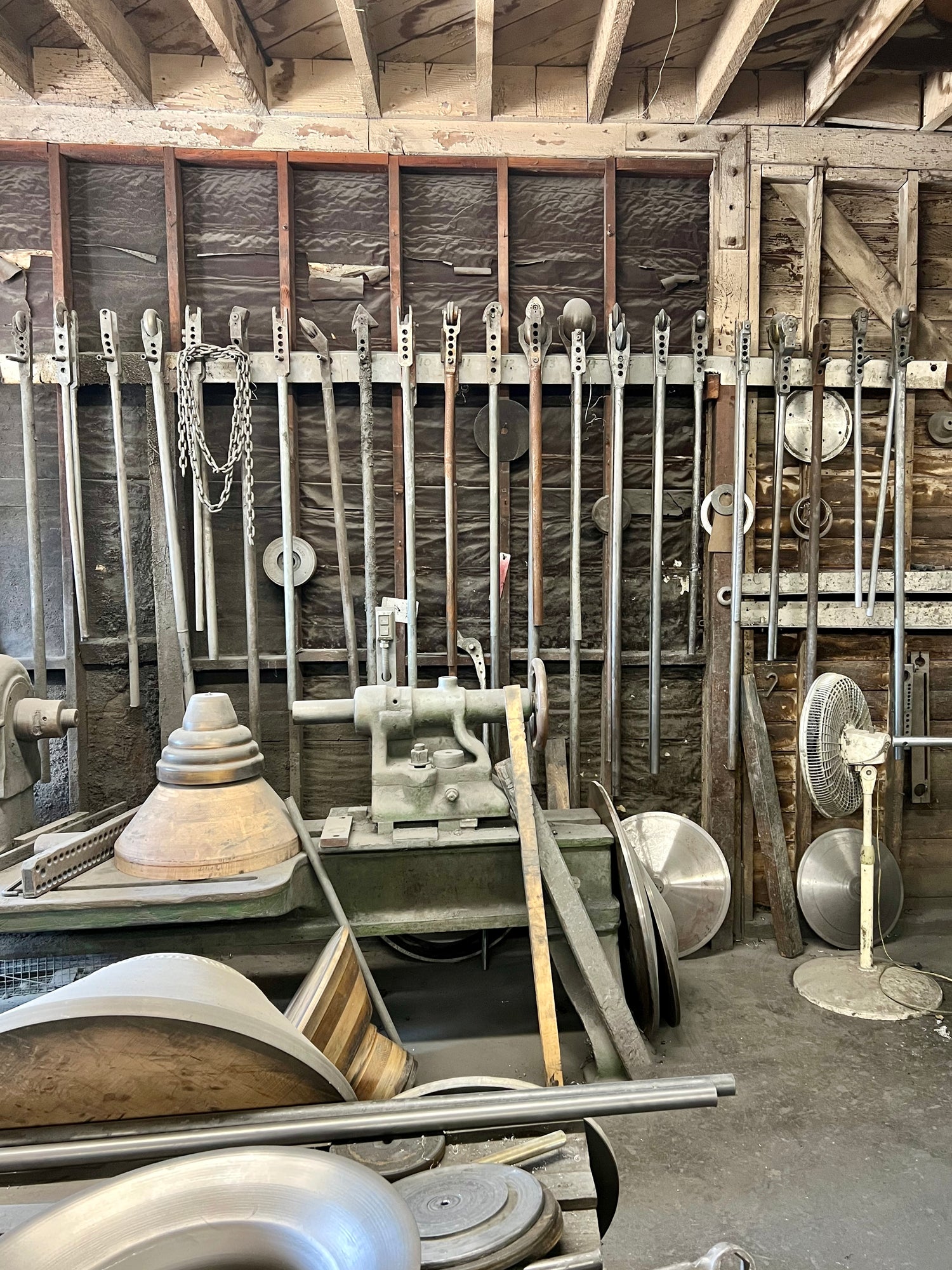 In metal spinning, a lathe is used to form sheet metal over an existing shape, or mold. It's a mesmerizing and meditative process, one that we often find excuses to go watch when our partners at H&H Manufacturing in Los Angeles are spinning parts for our Grain Family.