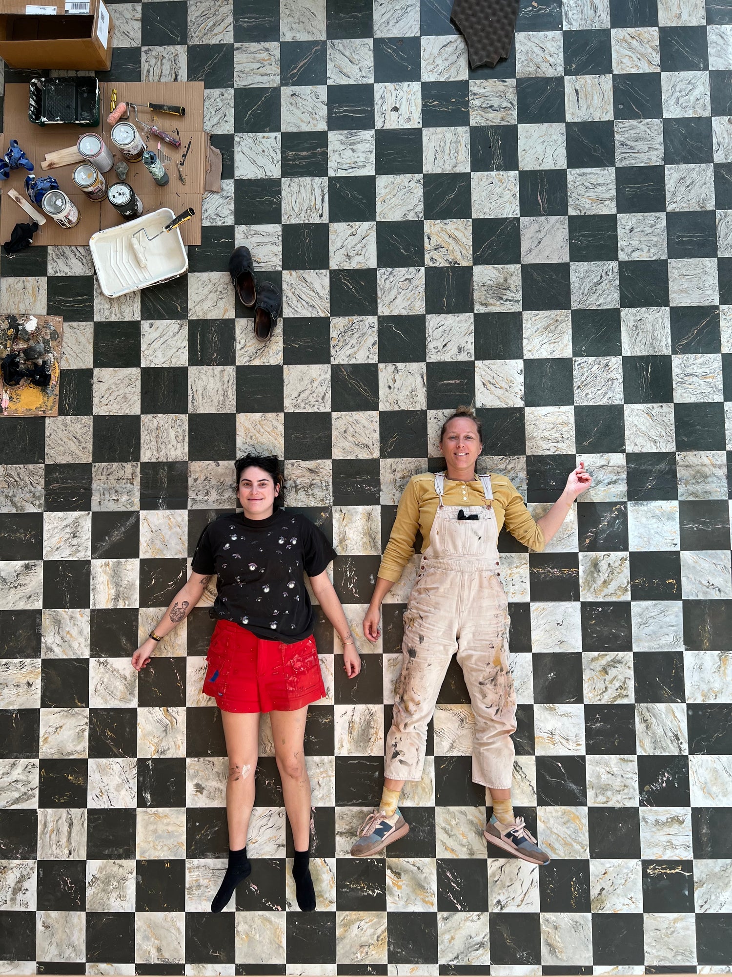 We recently spent a few Fridays at the Studio hand marbling a black and white checkerboard floor, continuing the original c. 1930 tiles (top) onto raw concrete (bottom).