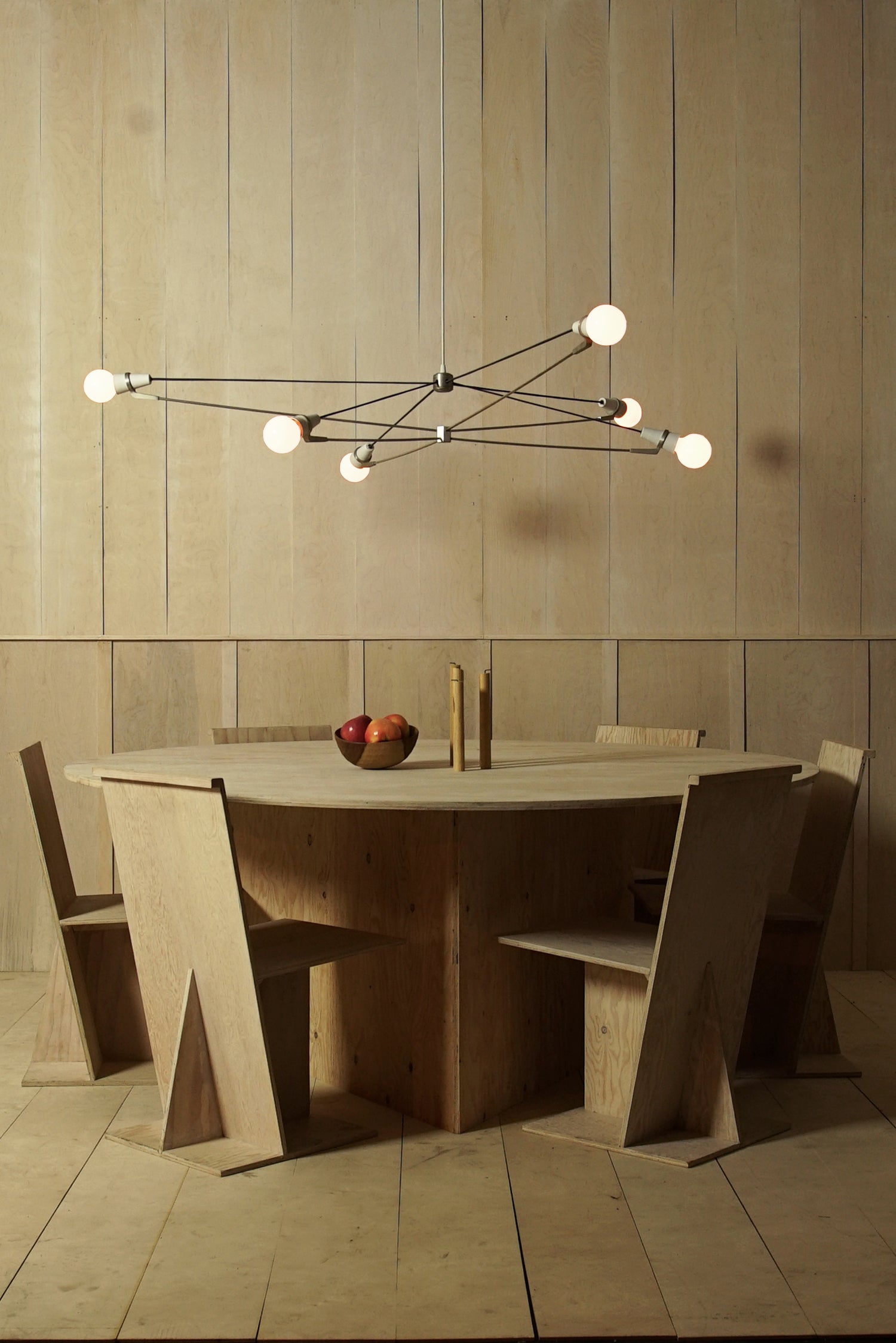 The Church Chandelier was first created to illuminate California Modernist Rudolph Schindler's Bethlehem Baptist Church in Los Angeles. Schindler was active in southern California from 1920-1953, working almost exclusively in LA building single family homes and small apartment buildings. He called his work "Space Architecture," designed not just for structure, but also for the climate, light, and mood of an interior space.