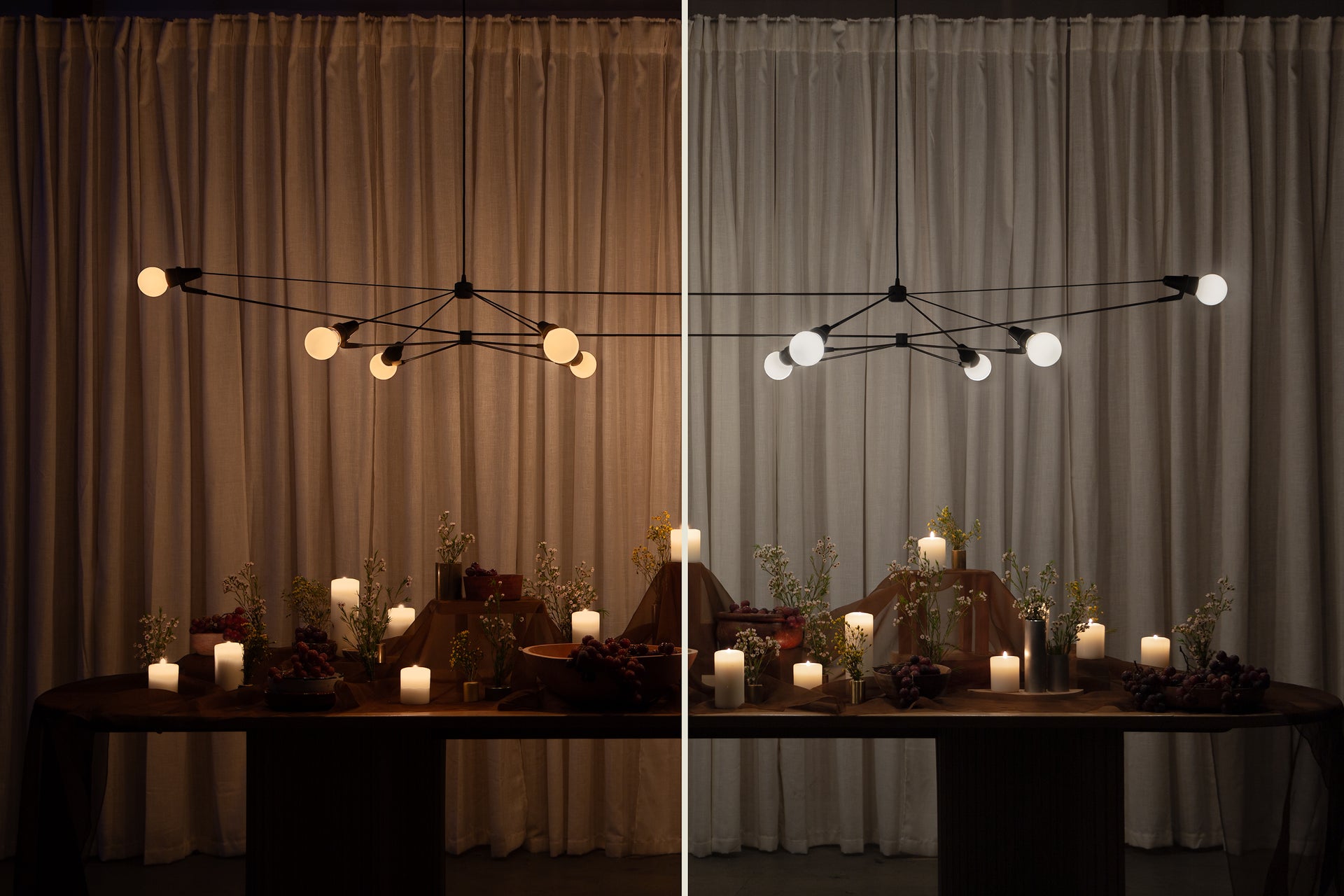 Dim to warm bulbs move from a brighter, whiter light to a warmer, more flattering amber that better mimics natural light, or candlelight. Check out the image below for example - a scene in our Studio that is lit by warm on dim bulbs on the left vs. standard LEDs dimmed to their typical dull gray, lighting up the scene on the right.