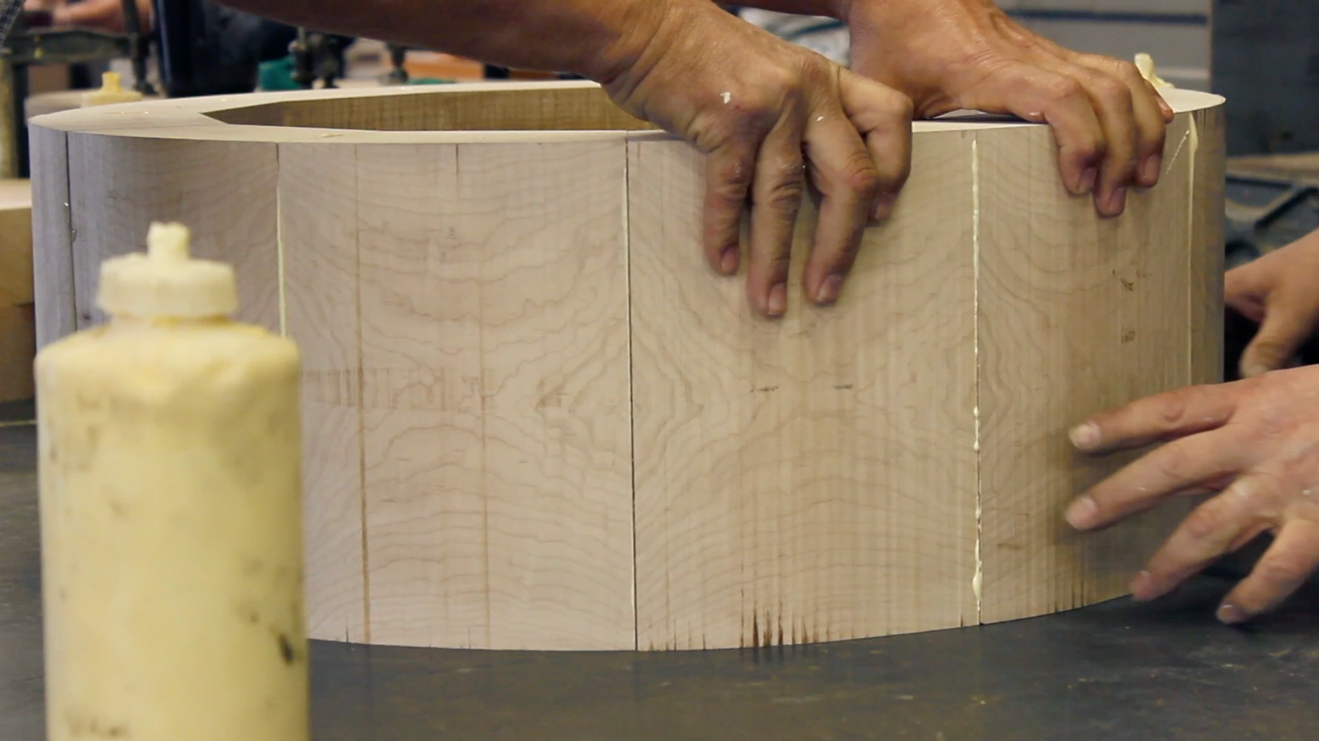 The approach is similar to barrel-making. Vertical wood pieces with bevelled edges are arranged to form a circle. These staves are glued and clamped. When the glue is dry, the outside and inside are usually lathed to achieve a smooth, round shell.