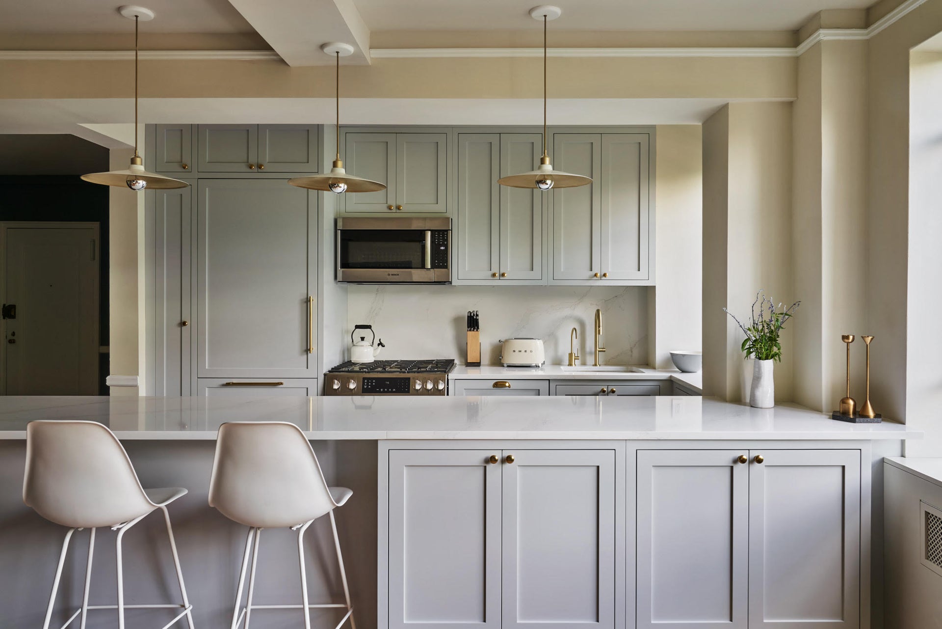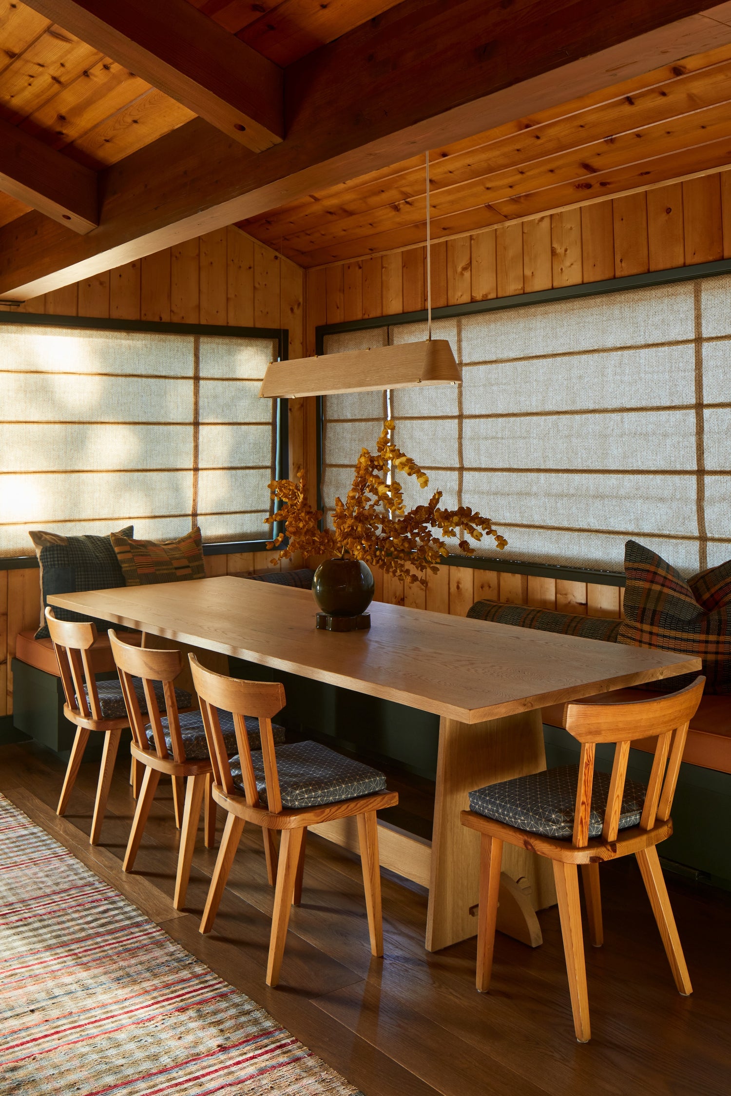 Above, Grain Pendant 16" Trio via Ruby Noren, Warby Parker. At right, Beam Oak 46" in a kitchen nook by Wall for Apricots. Photograph by Ye Rin Mok.