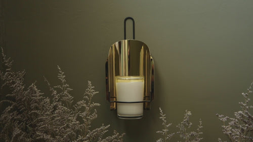 Our Candle Sconce features an adjustable brass reflector. One Le Feu De L'Eau candle included with purchase, in Ivory (Cedar Leaf, Asian Patchouli, Vanilla, Amber). 10" x 4" x 4"
