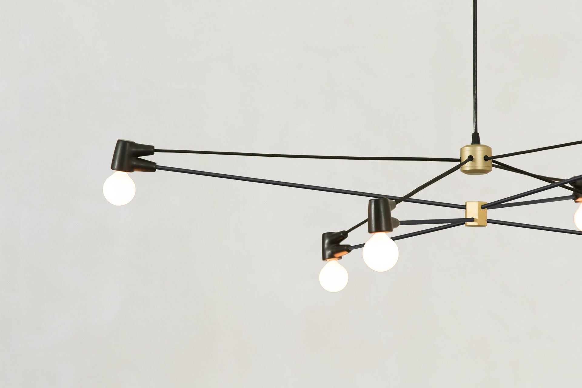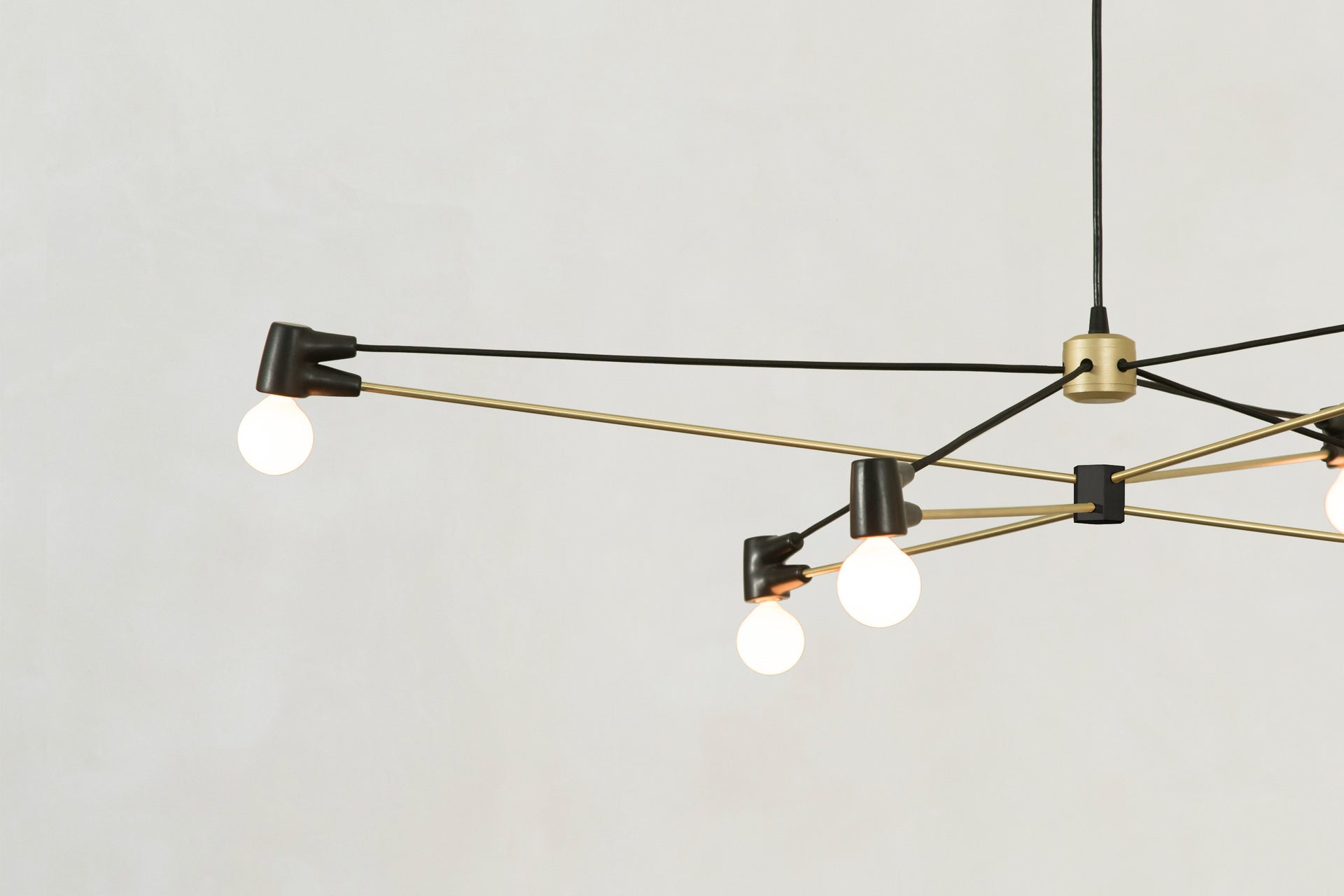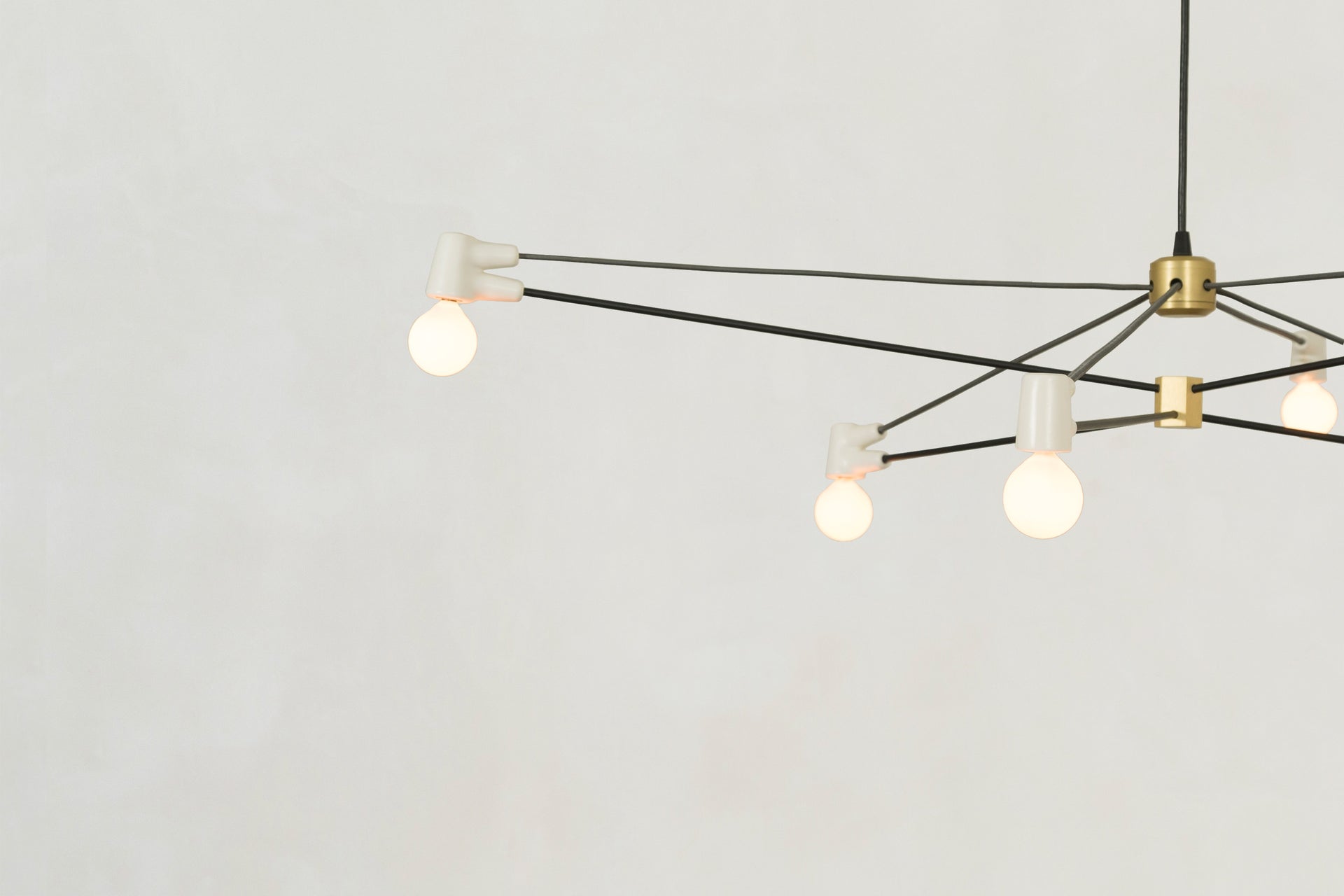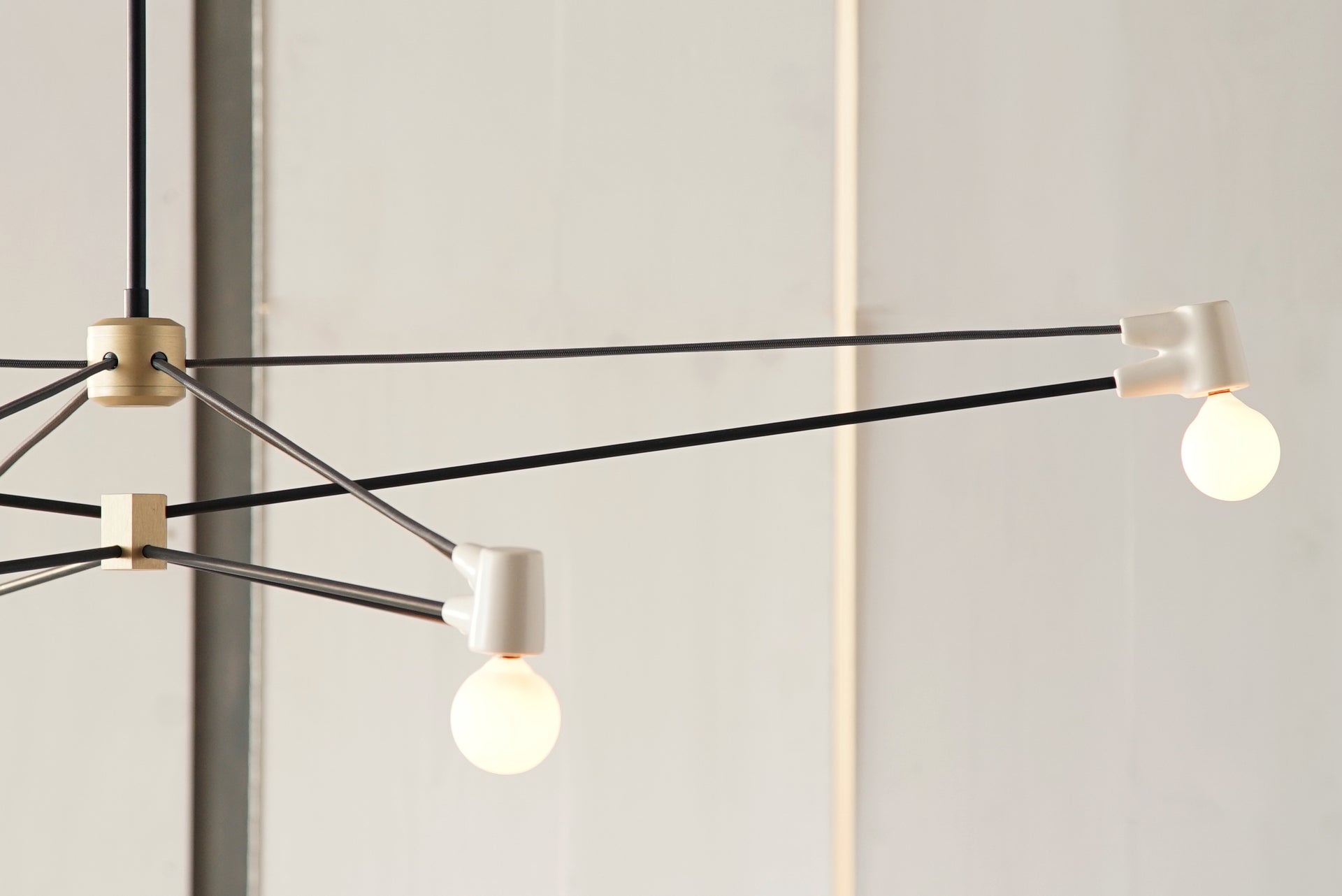 The push and pull of this tensegrity fixture holds hand cast ceramic sockets aloft. The ceramic sockets cradle candelabra-base bulbs, creating a constellation that is suited to residential and commercial spaces alike. Metal rods. Cloth covered electrical cord.