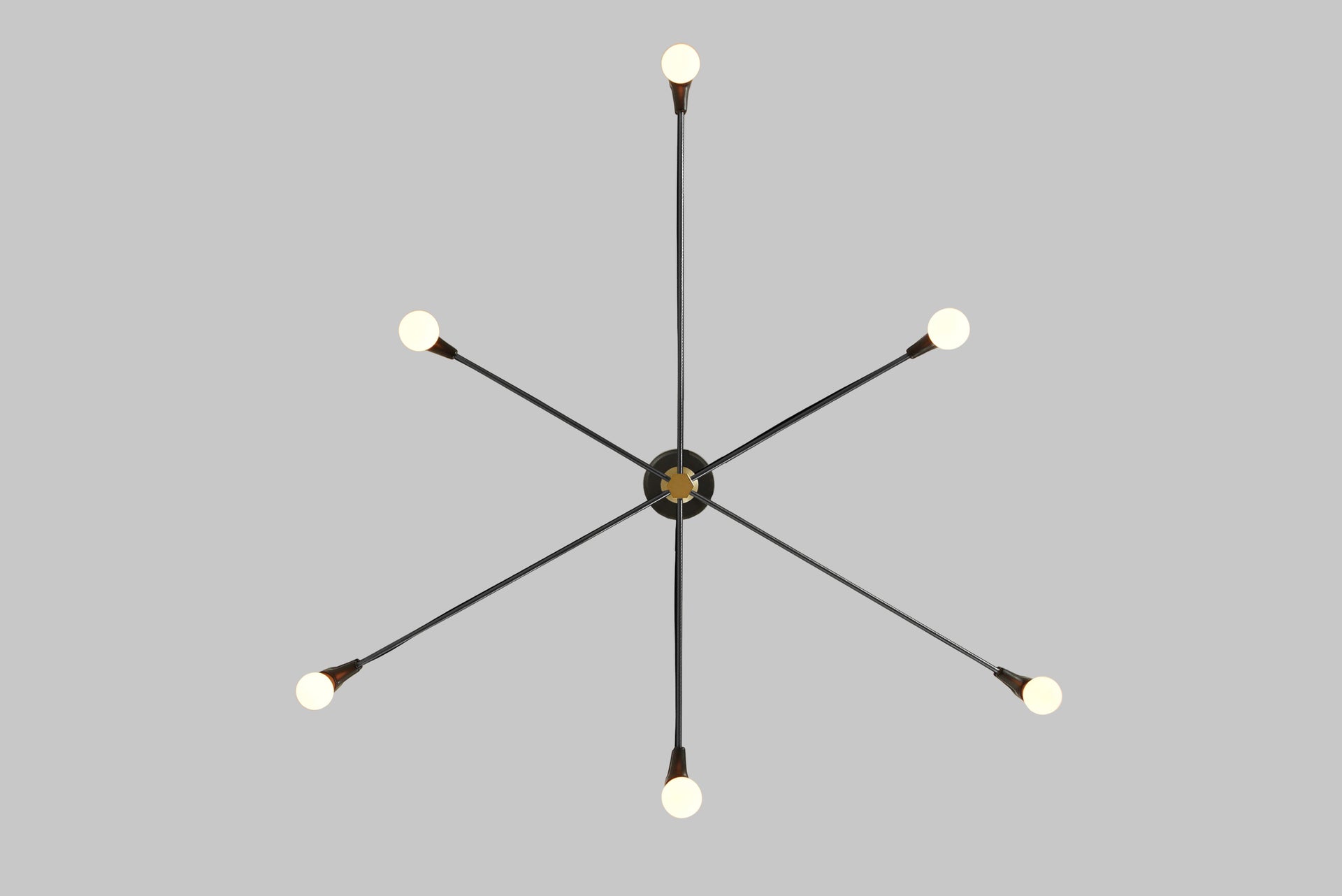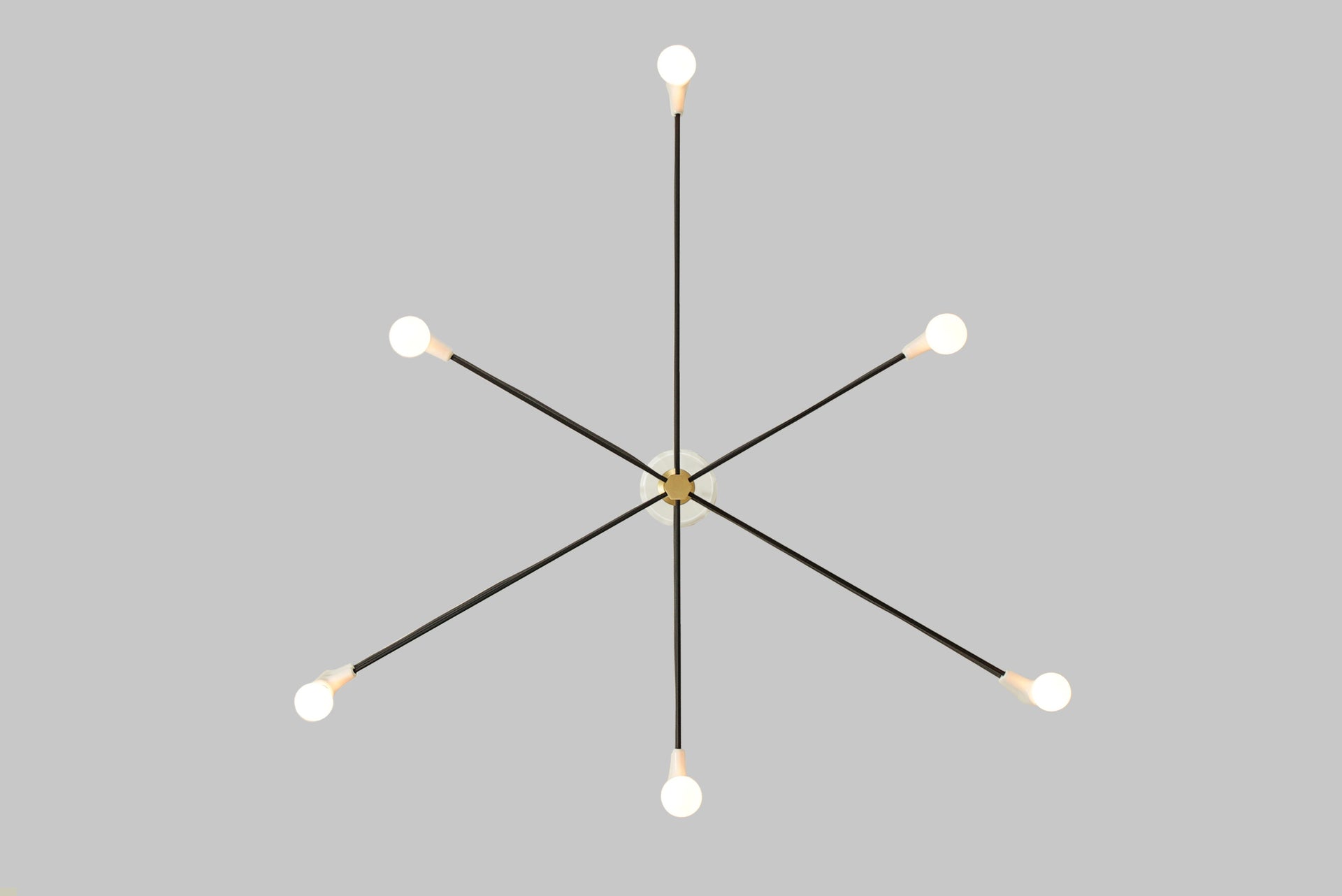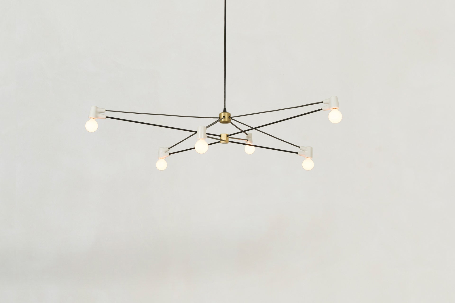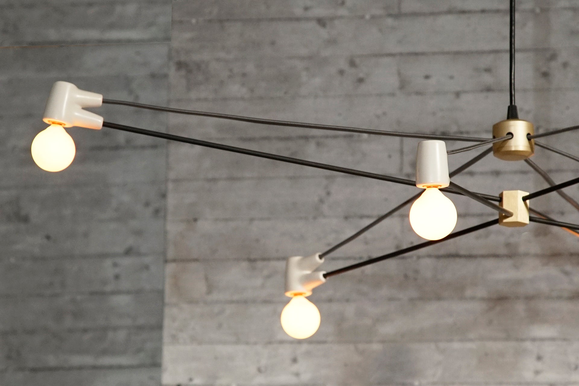 The push and pull of this tensegrity fixture holds hand cast ceramic sockets aloft. The ceramic sockets cradle candelabra-base bulbs, creating a constellation that is suited to residential and commercial spaces alike. Metal rods. Cloth covered electrical cord.