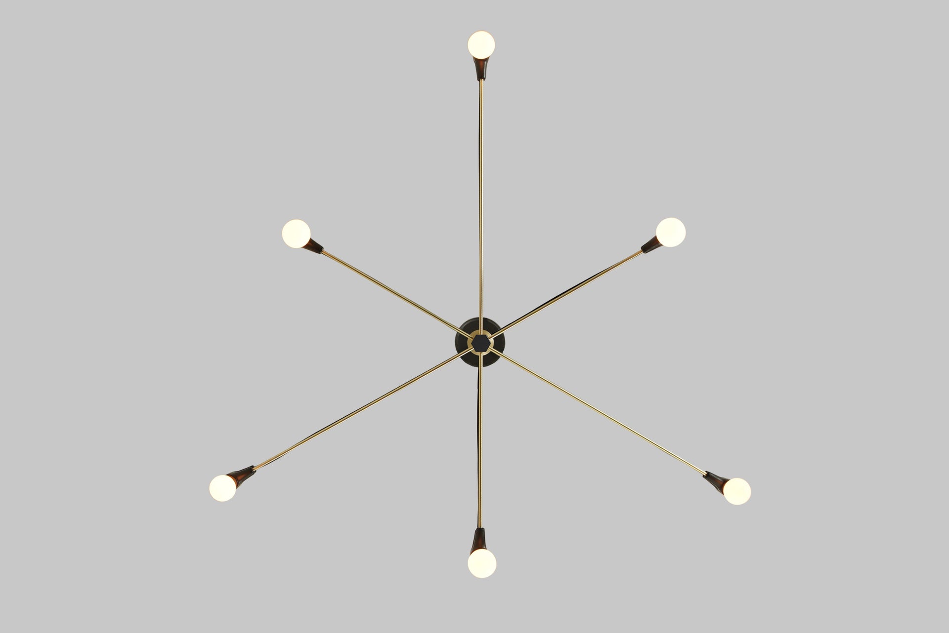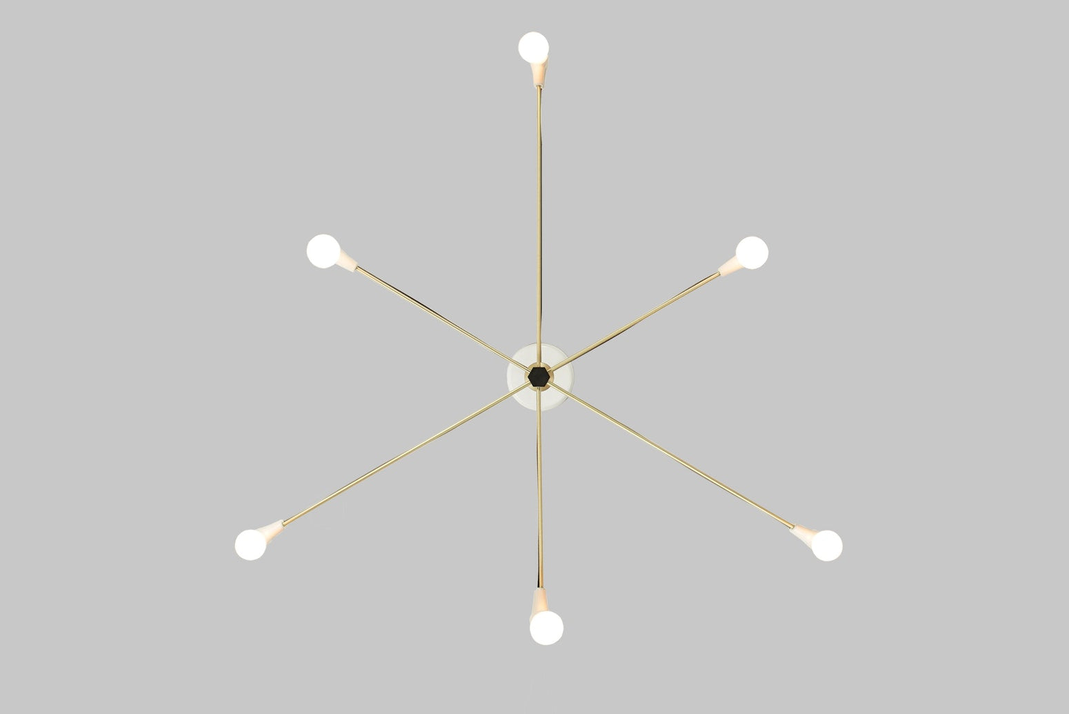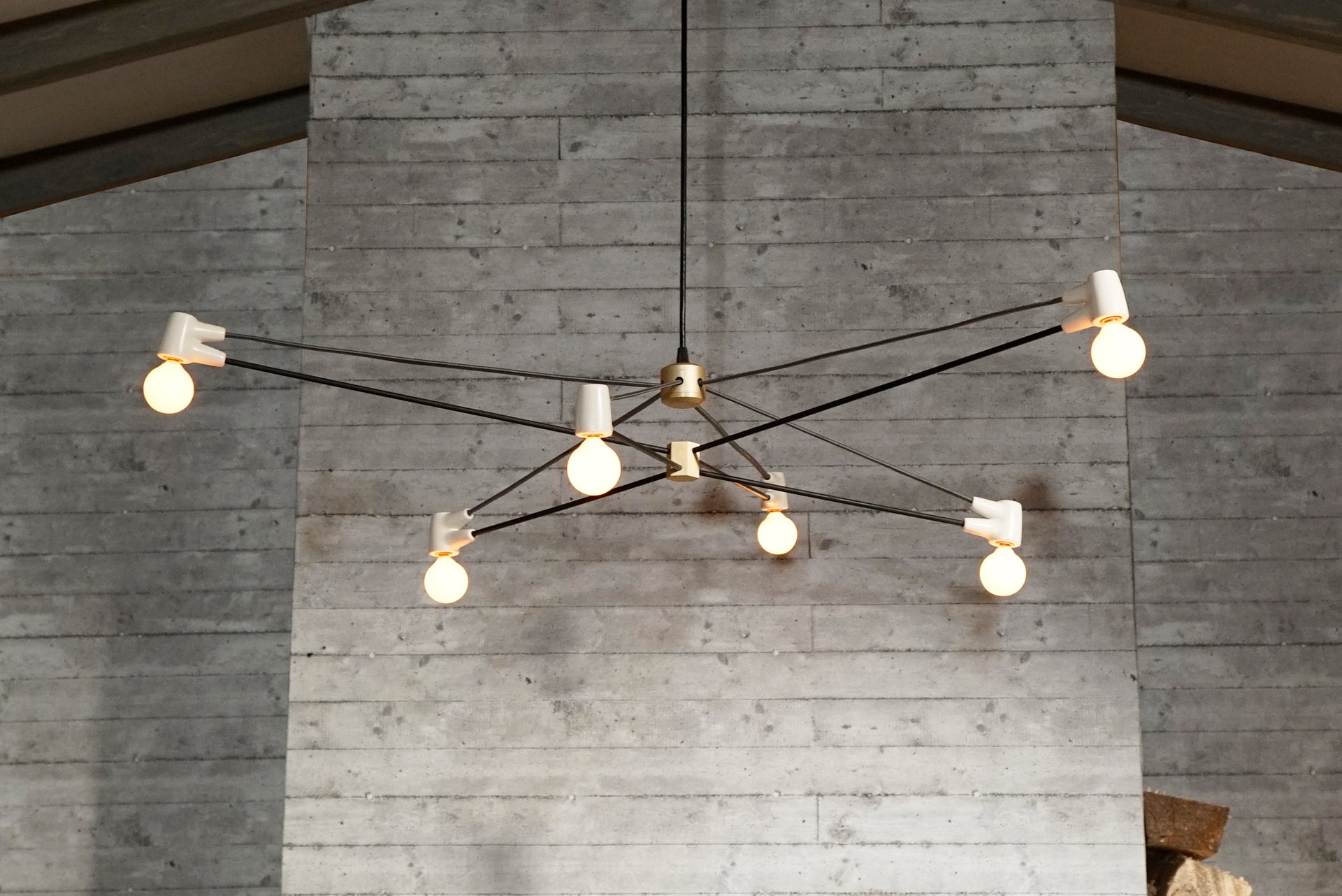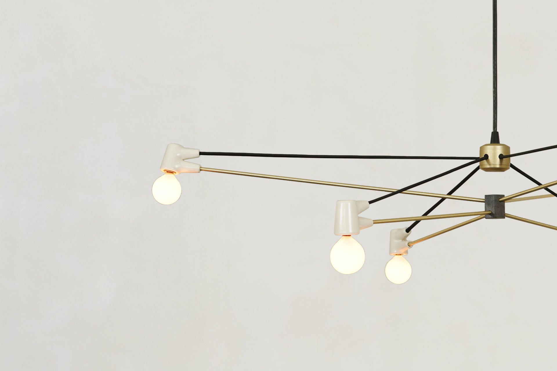The push and pull of this tensegrity fixture holds hand cast ceramic sockets aloft. The ceramic sockets cradle candelabra-base bulbs, creating a constellation that is suited to residential and commercial spaces alike. Metal rods. Cloth covered electrical cord.