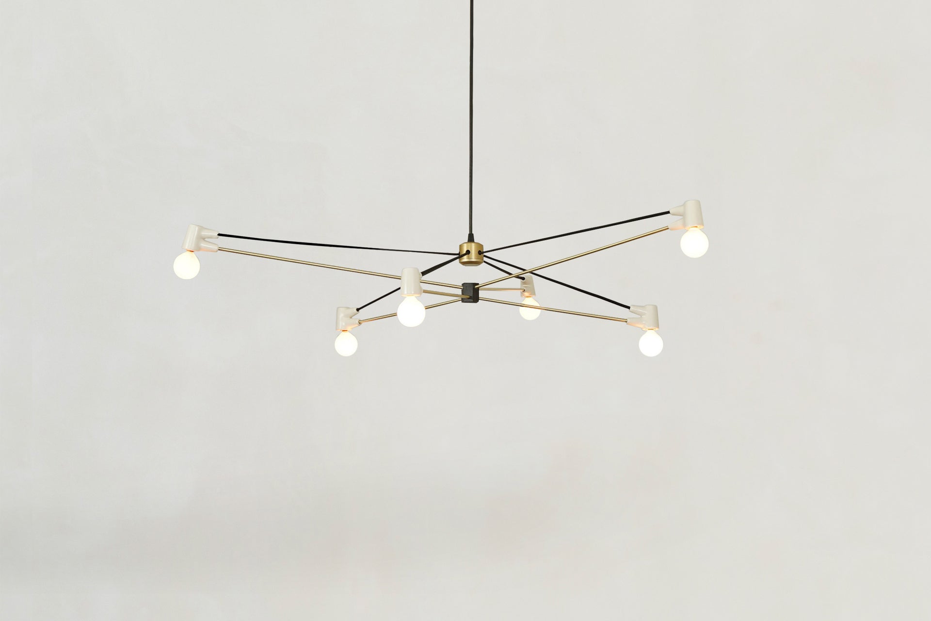 The Cord Family is a celebration of form driven by physics. The series began as an exercise to simplify Jean Prouvé’s classic Potence lamp by using the fixture's electrical cord in place of the guy wire. The result is a pleasing symmetry between the structural elements. The family utilizes the principle of tensegrity, or floating compression, where the compression of the steel arm resists the tension of the cloth electrical cord to hold the custom ceramic socket aloft.