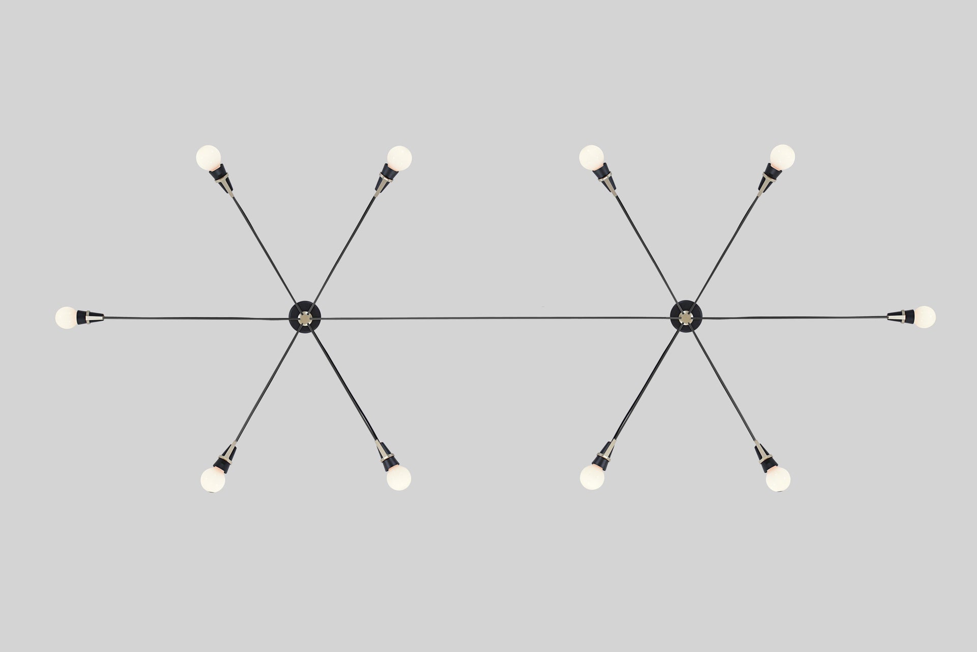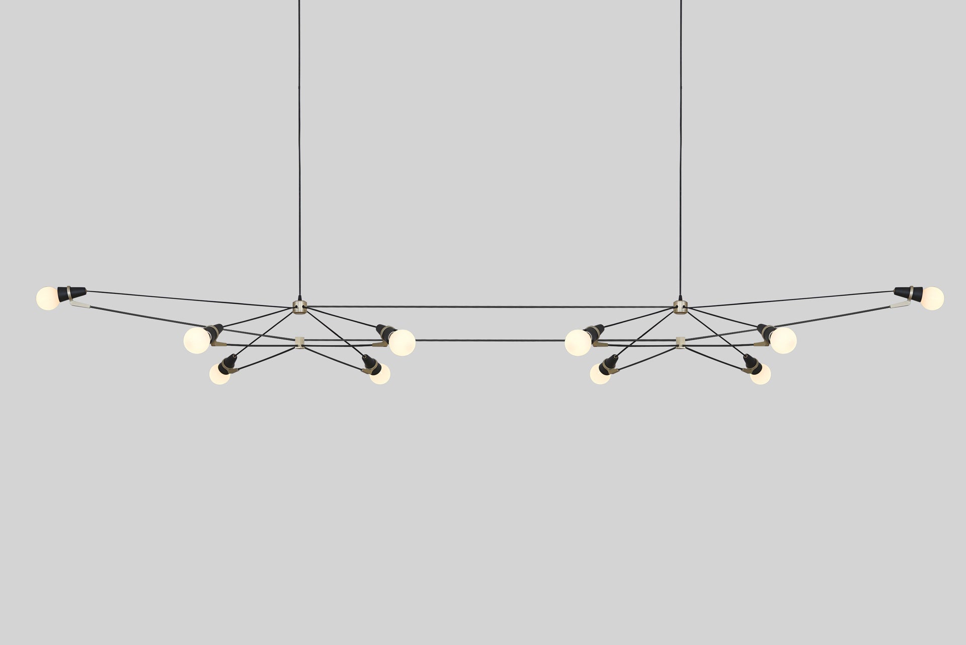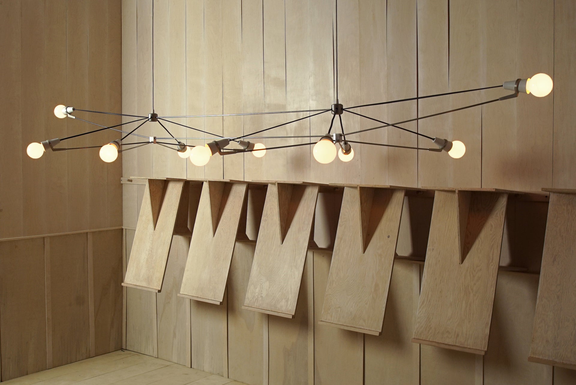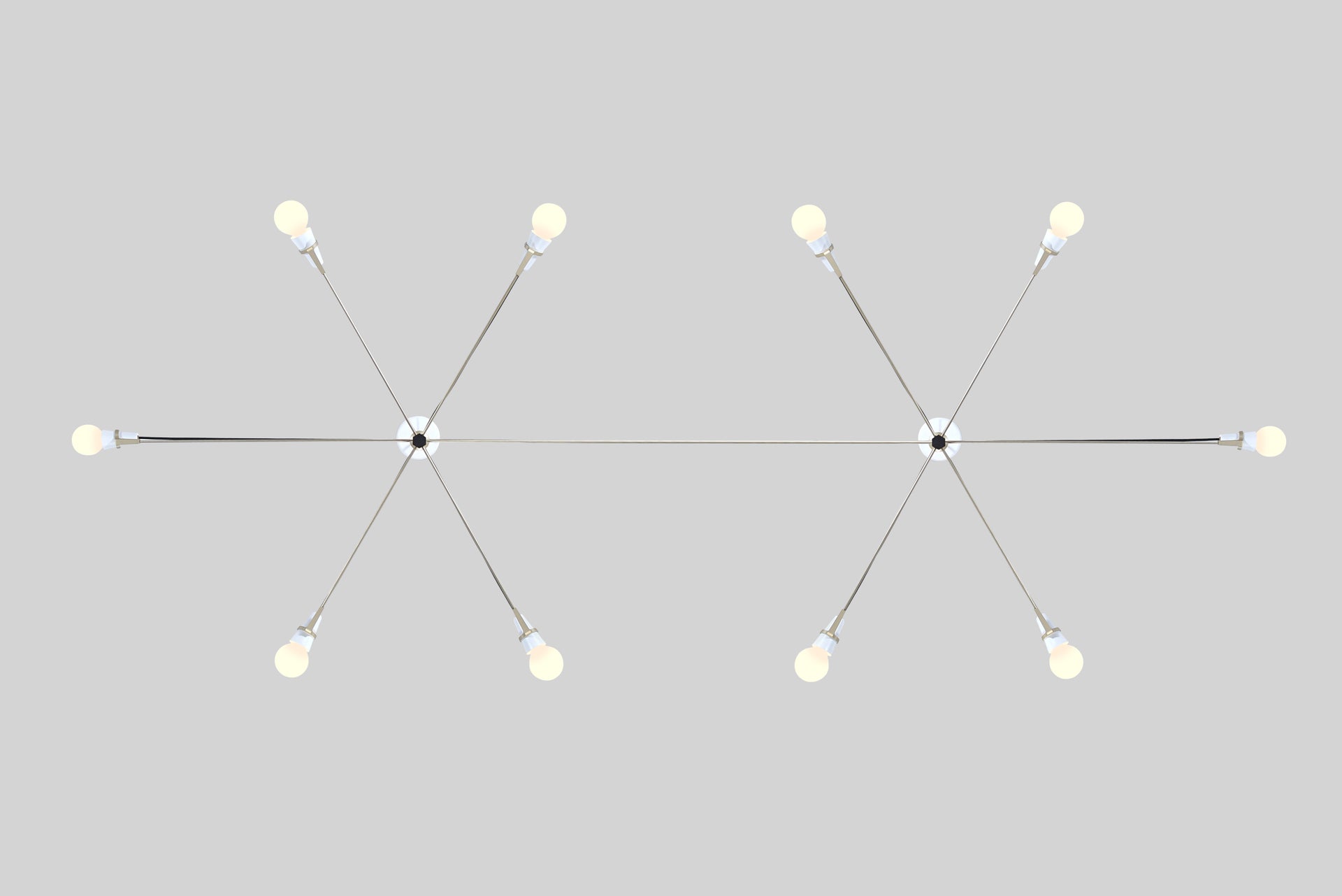 Ten floating bulbs held aloft through a simple armature of cords and rods, for a dramatic finish.