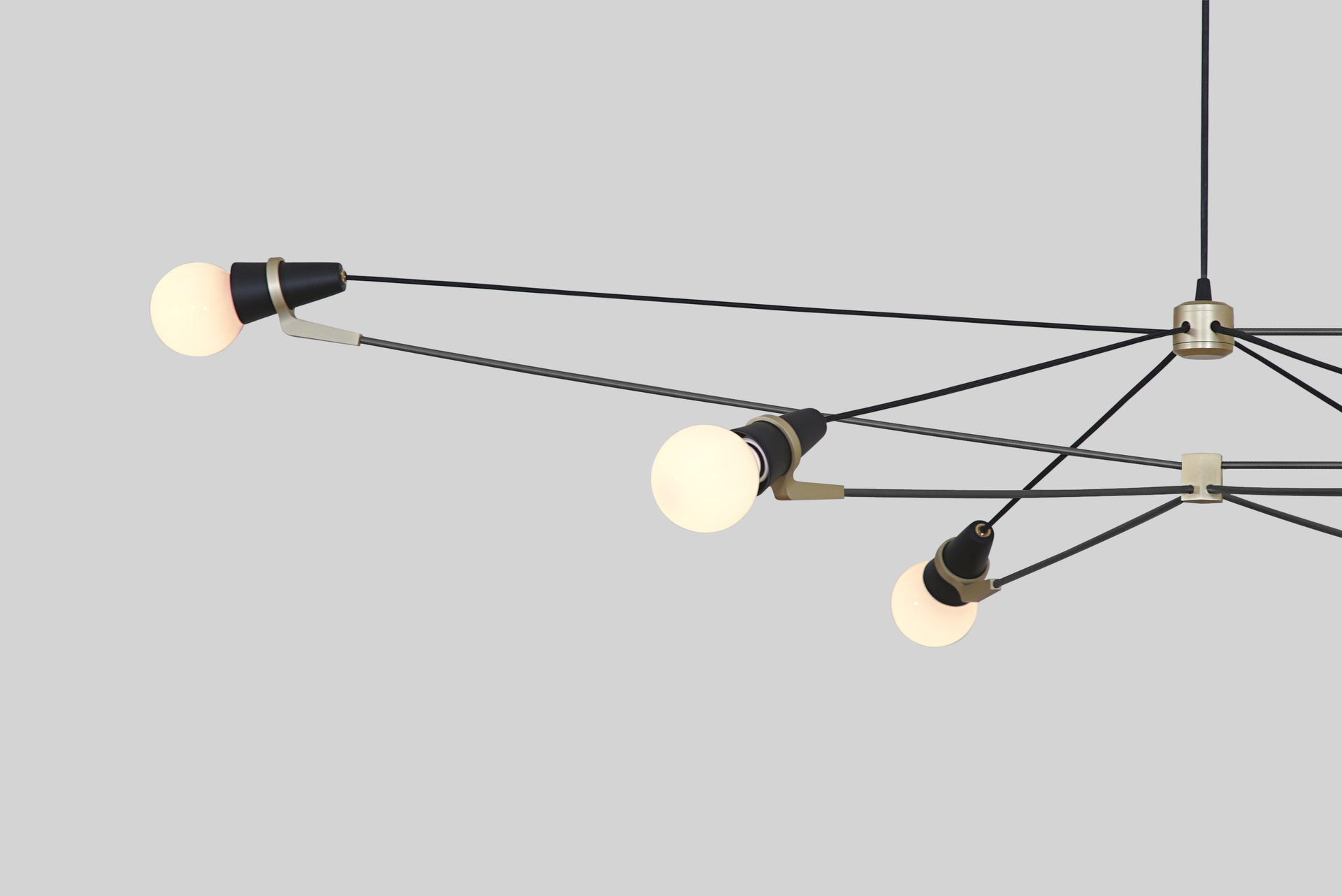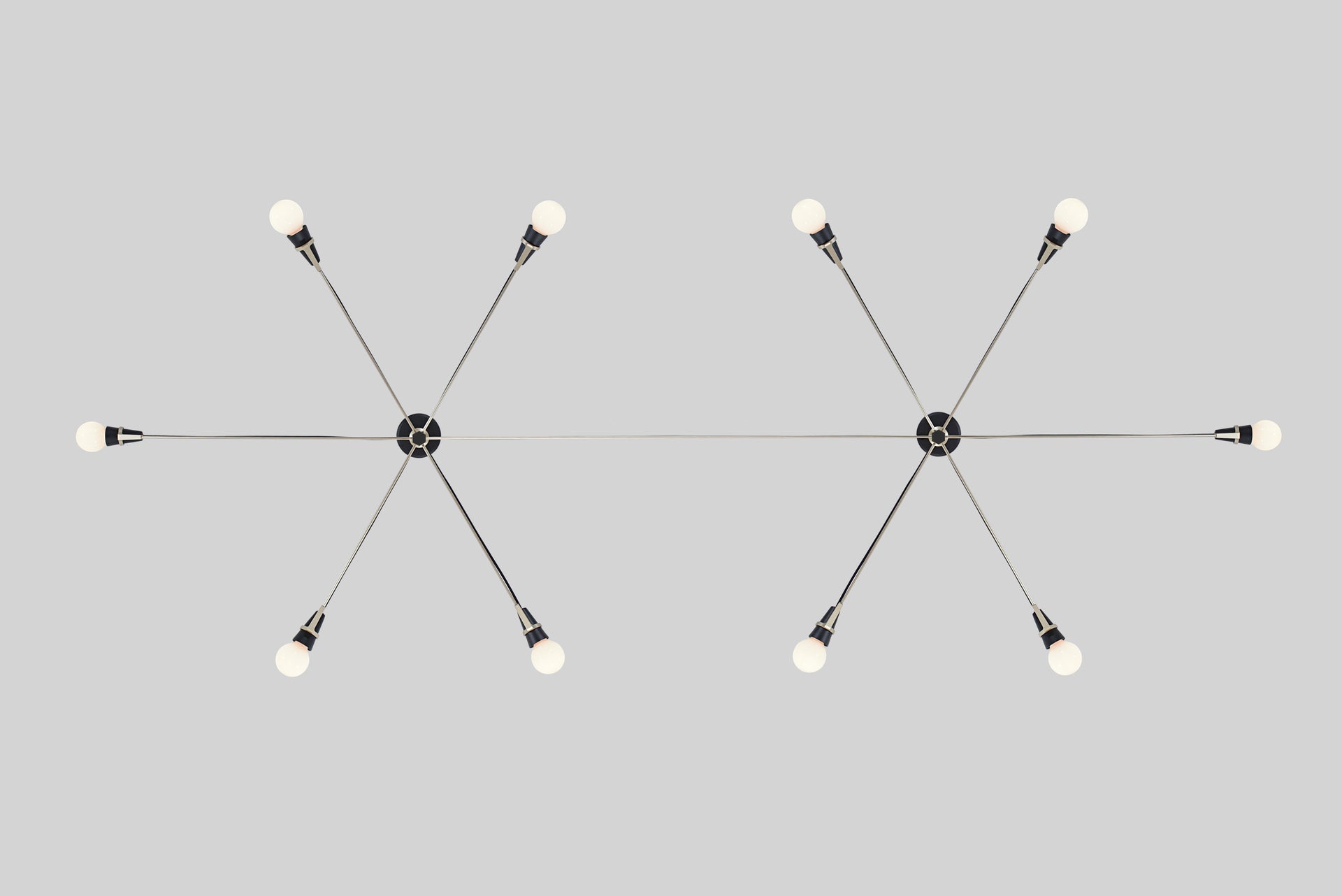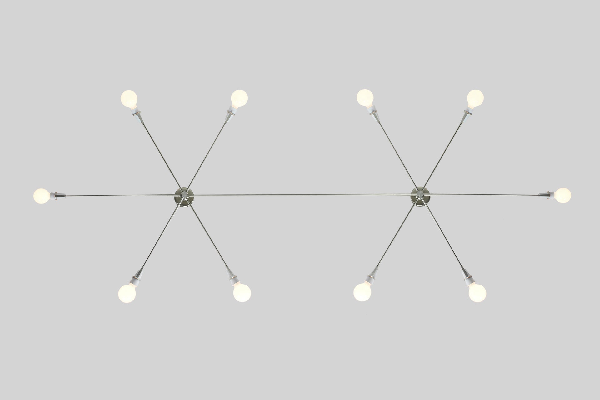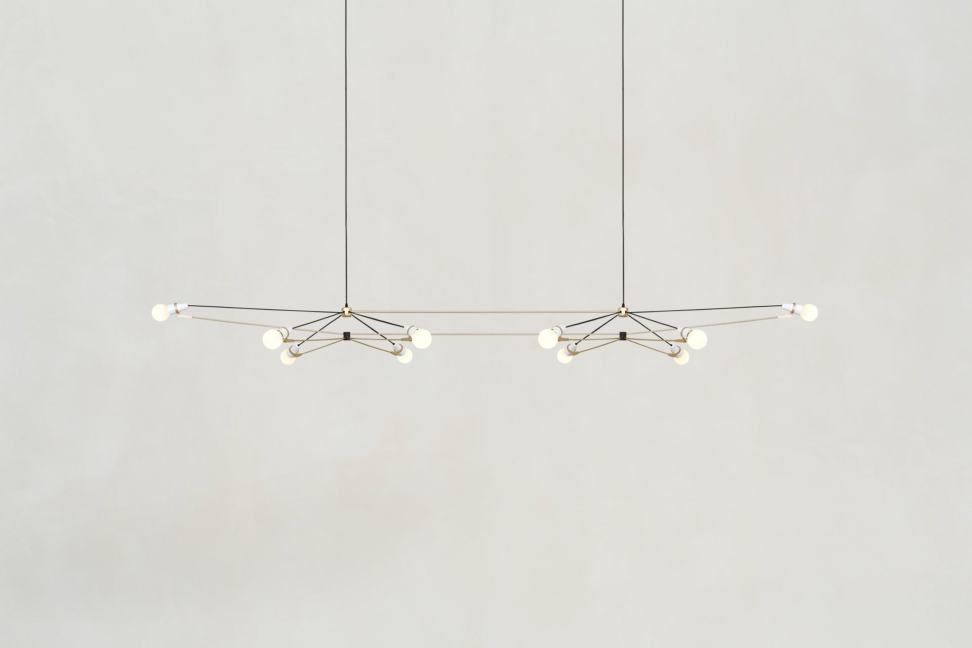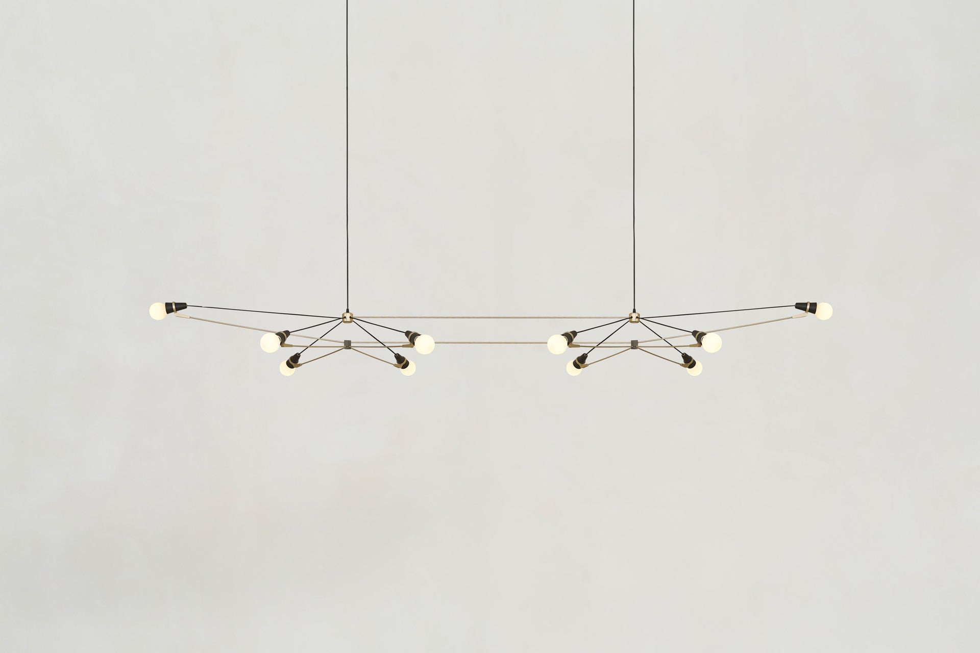 Ten floating bulbs held aloft through a simple armature of cords and rods, for a dramatic finish.