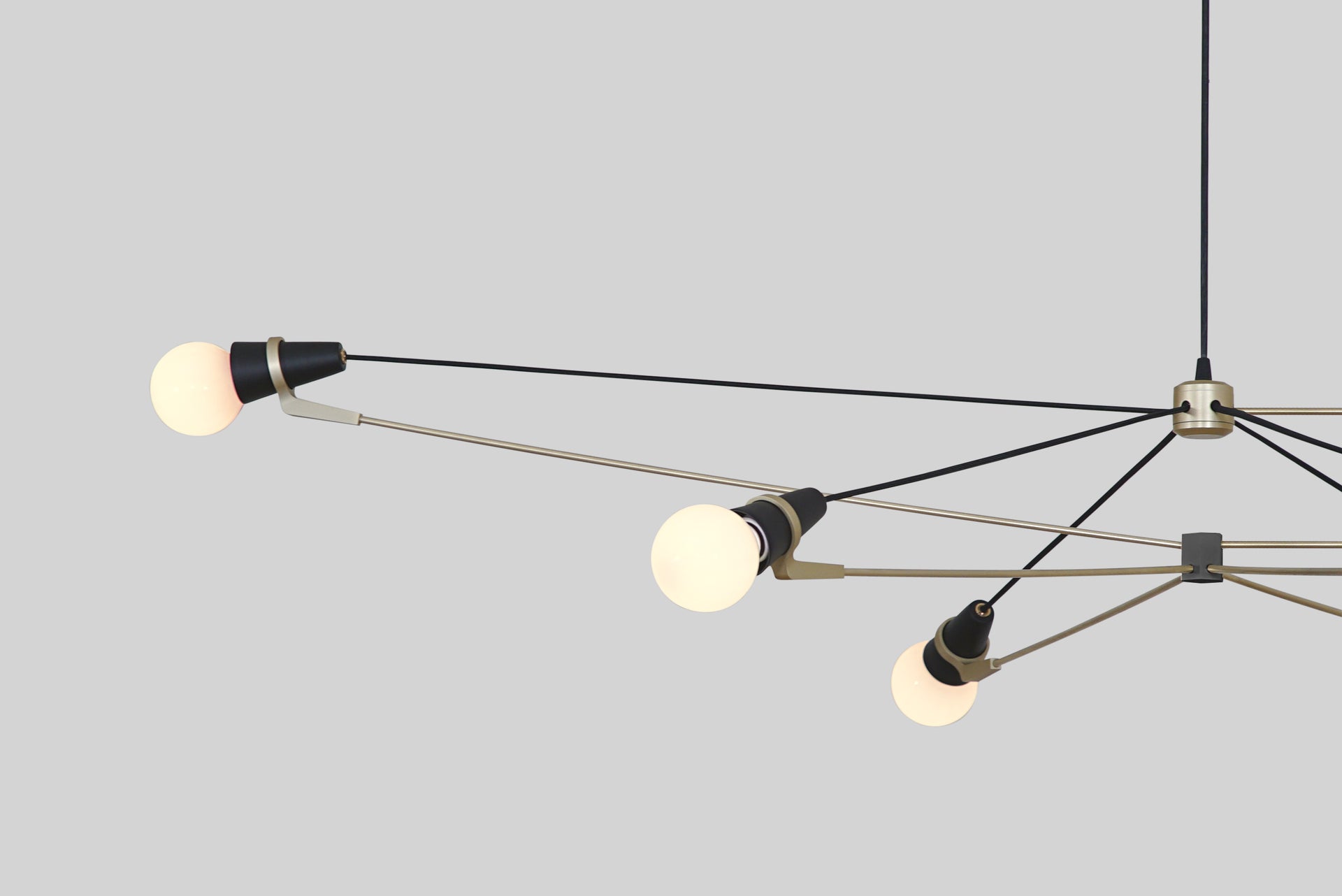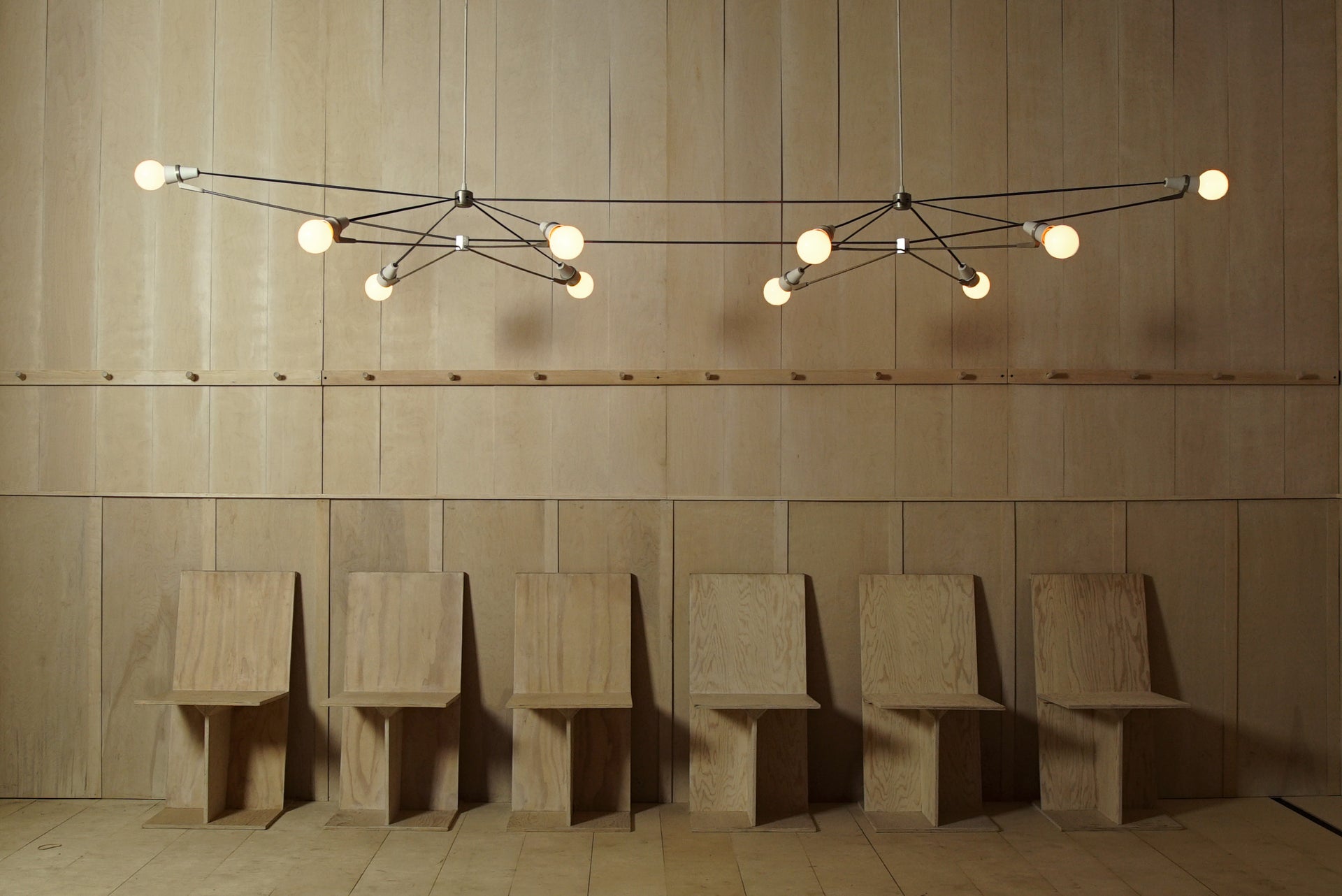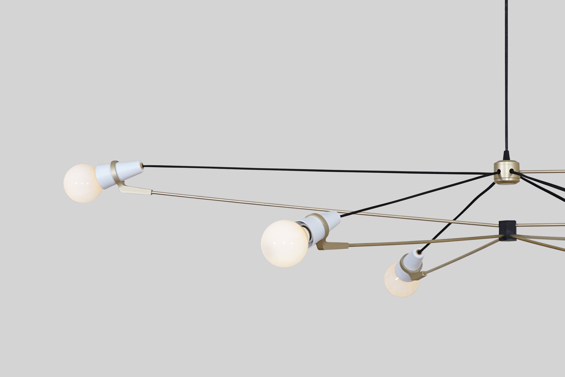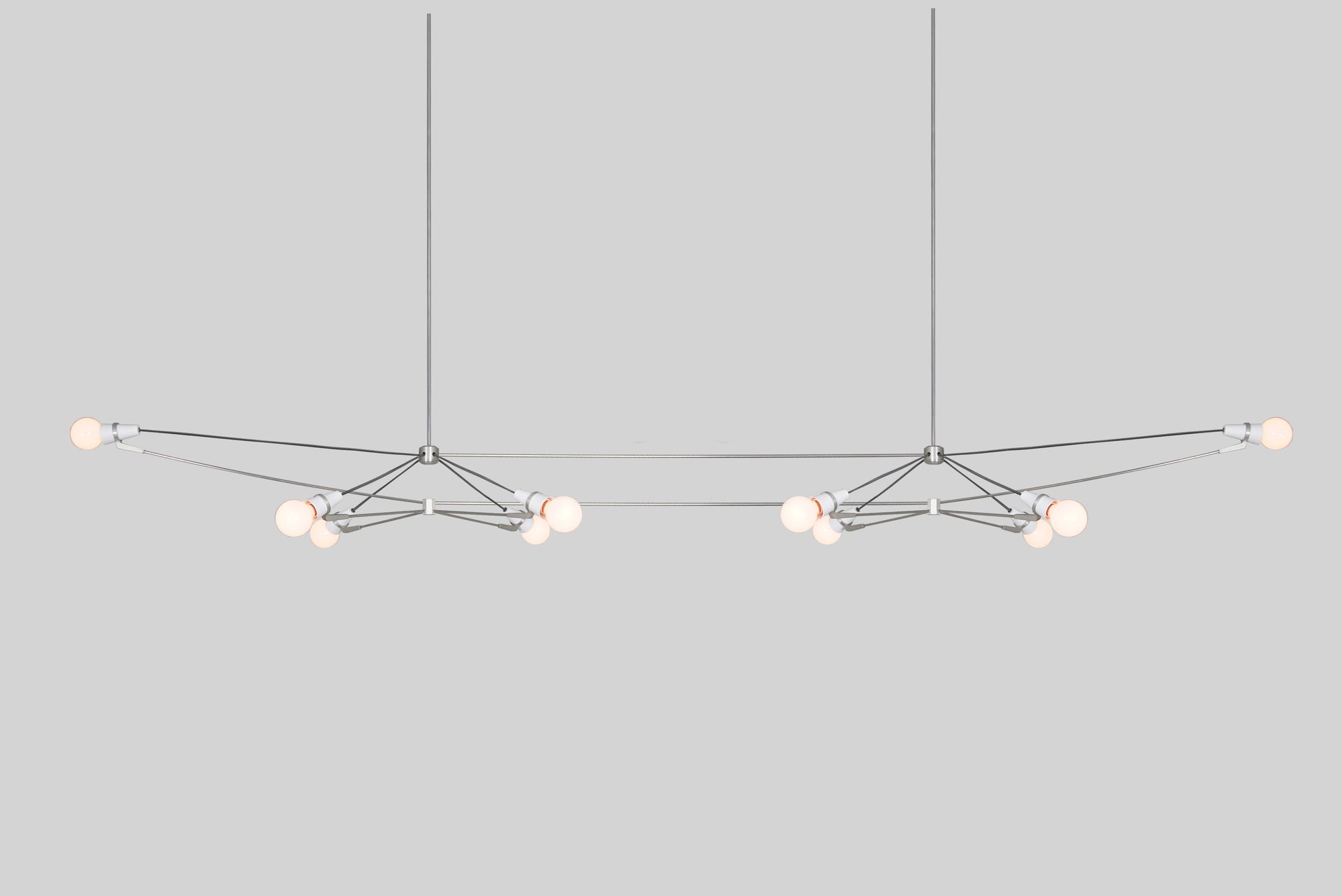 Ten floating bulbs held aloft through a simple armature of cords and rods, for a dramatic finish.