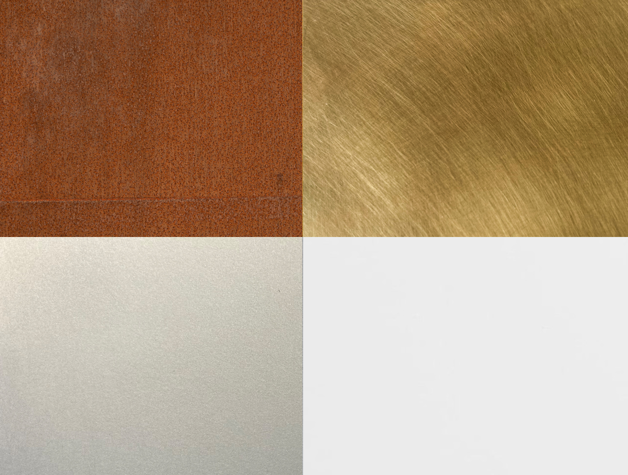 Our Luxe Metals Kit includes samples of our Burnished Brass, Corten Steel and Matte Nickel.