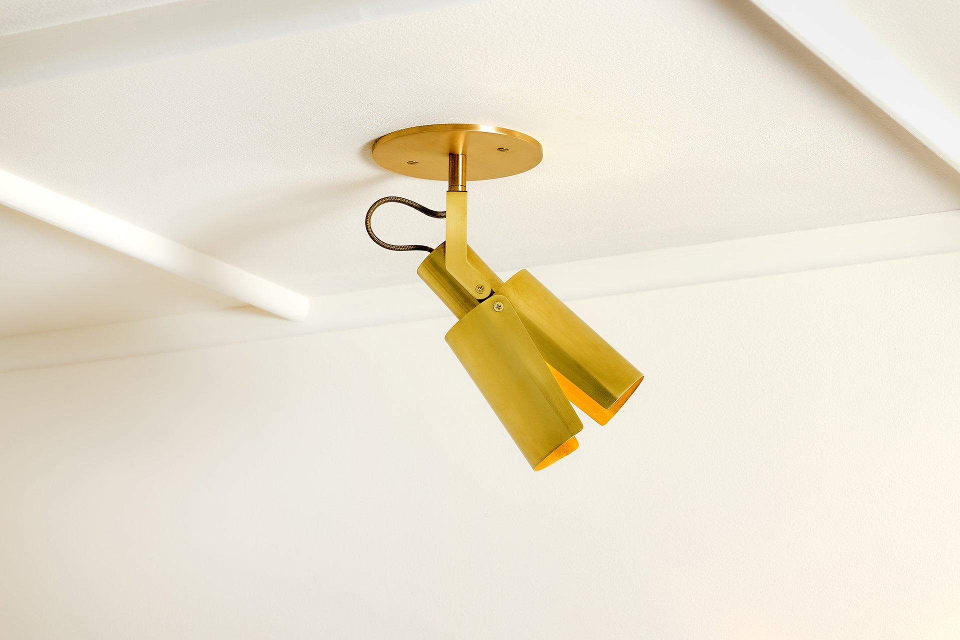 A ceiling-mounted spotlight with a sculptural, interactive form. A custom clevis enables vertical pivoting, while a custom in-line swivel allows for 350 degrees of rotation.
