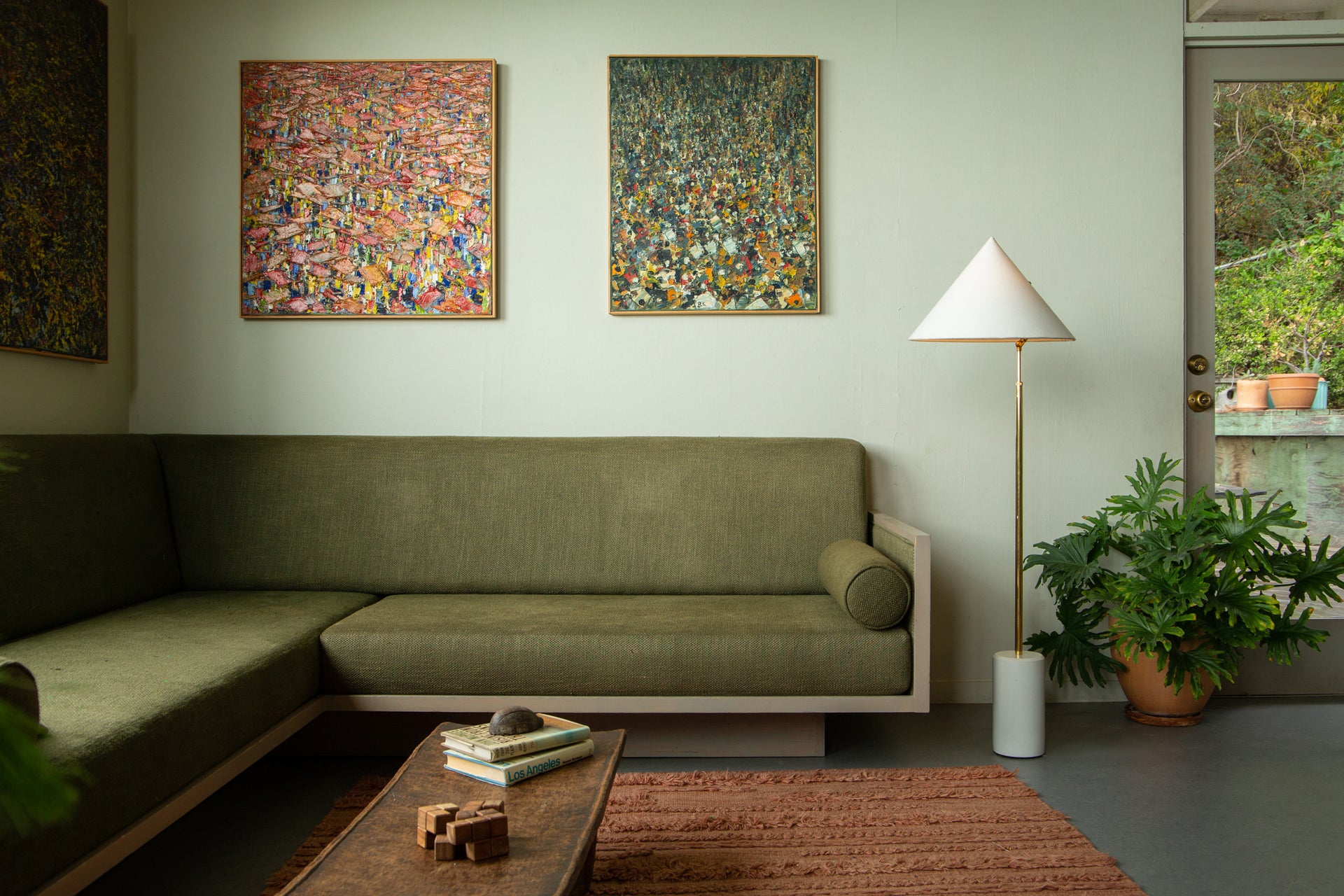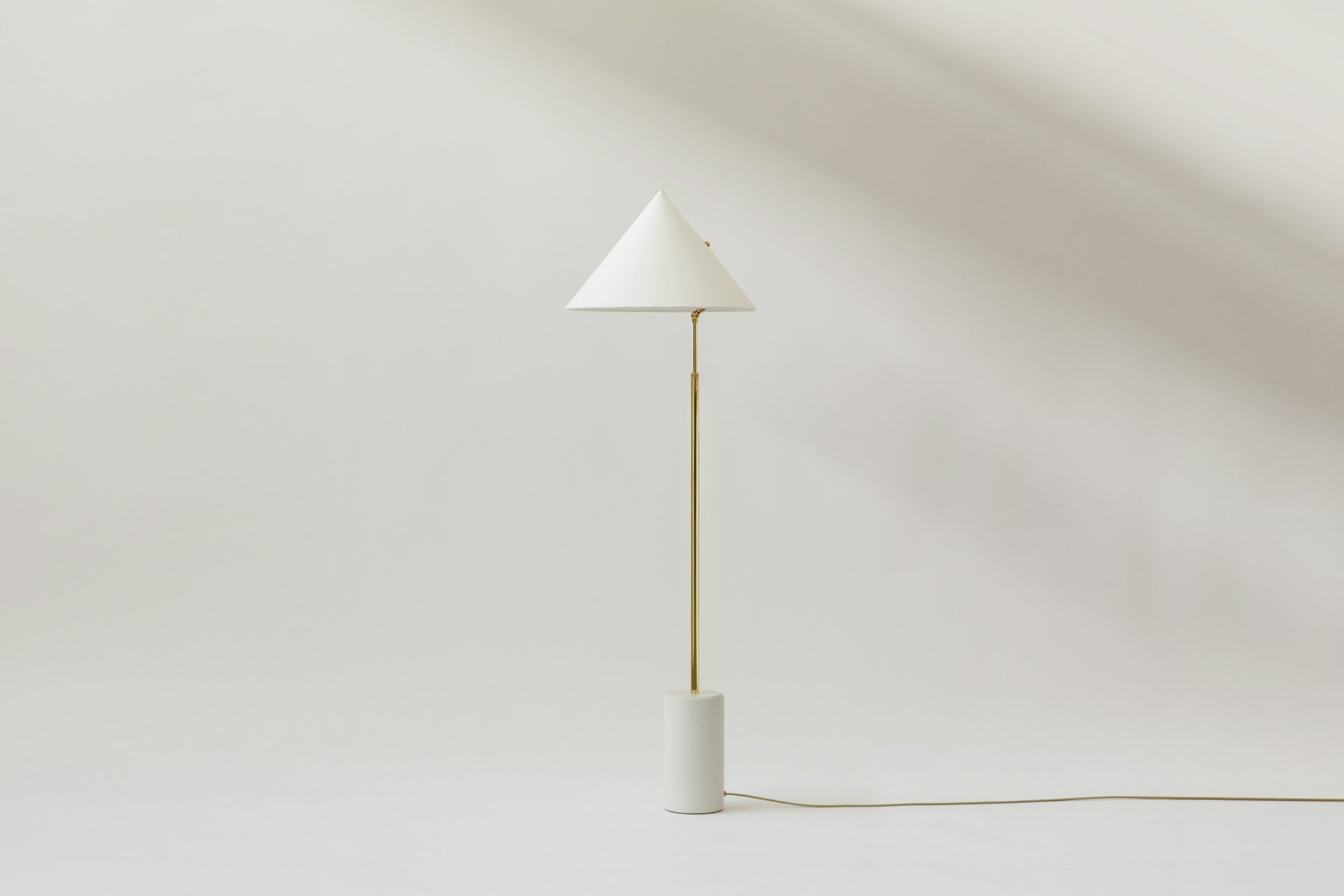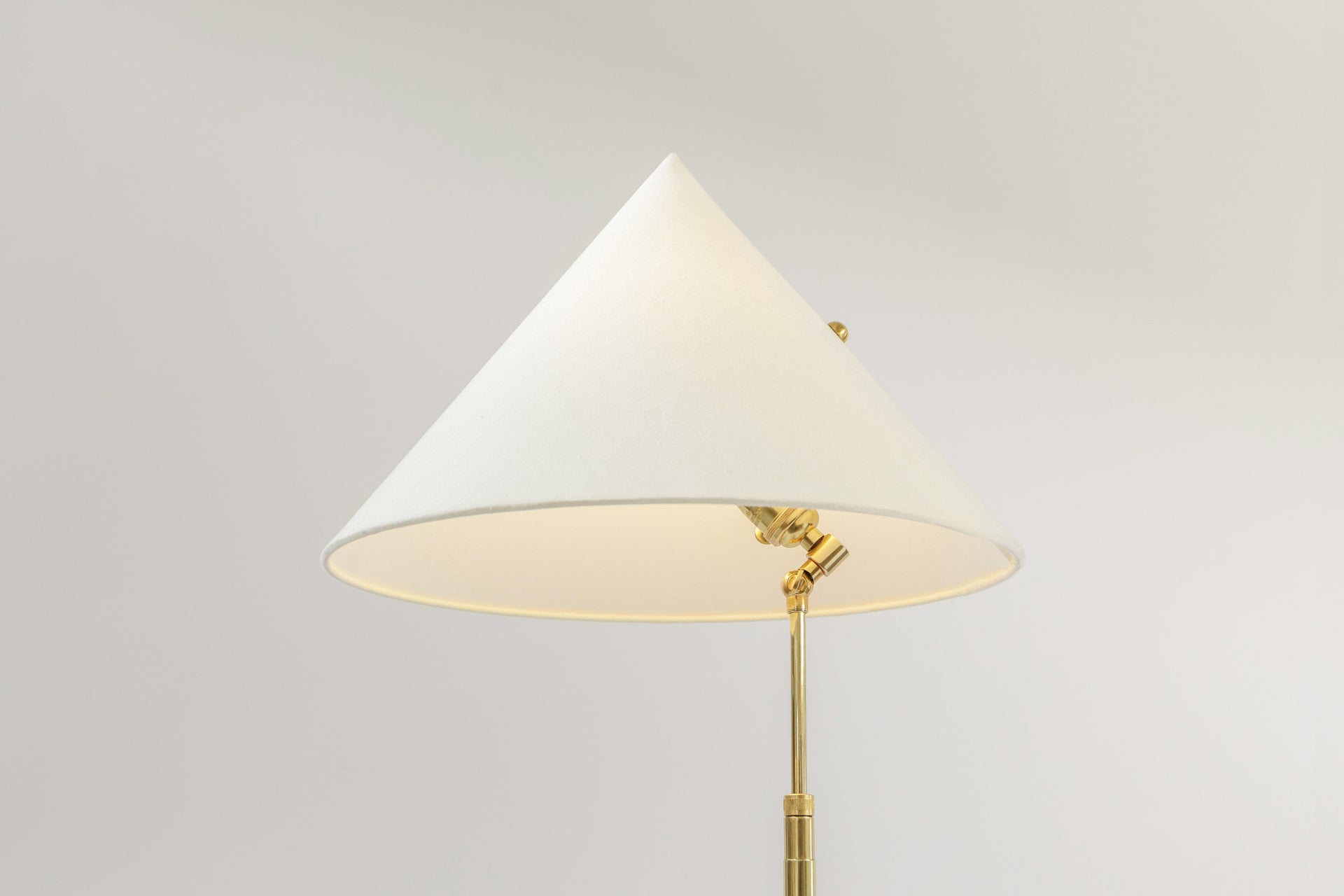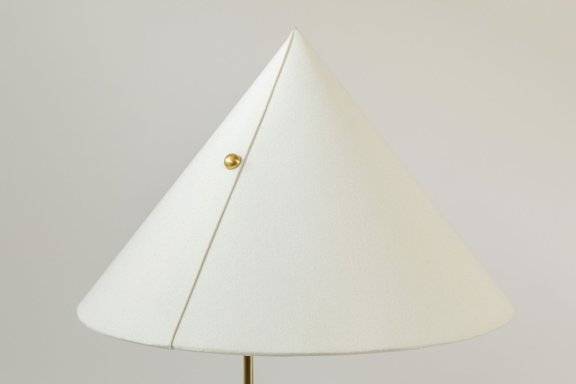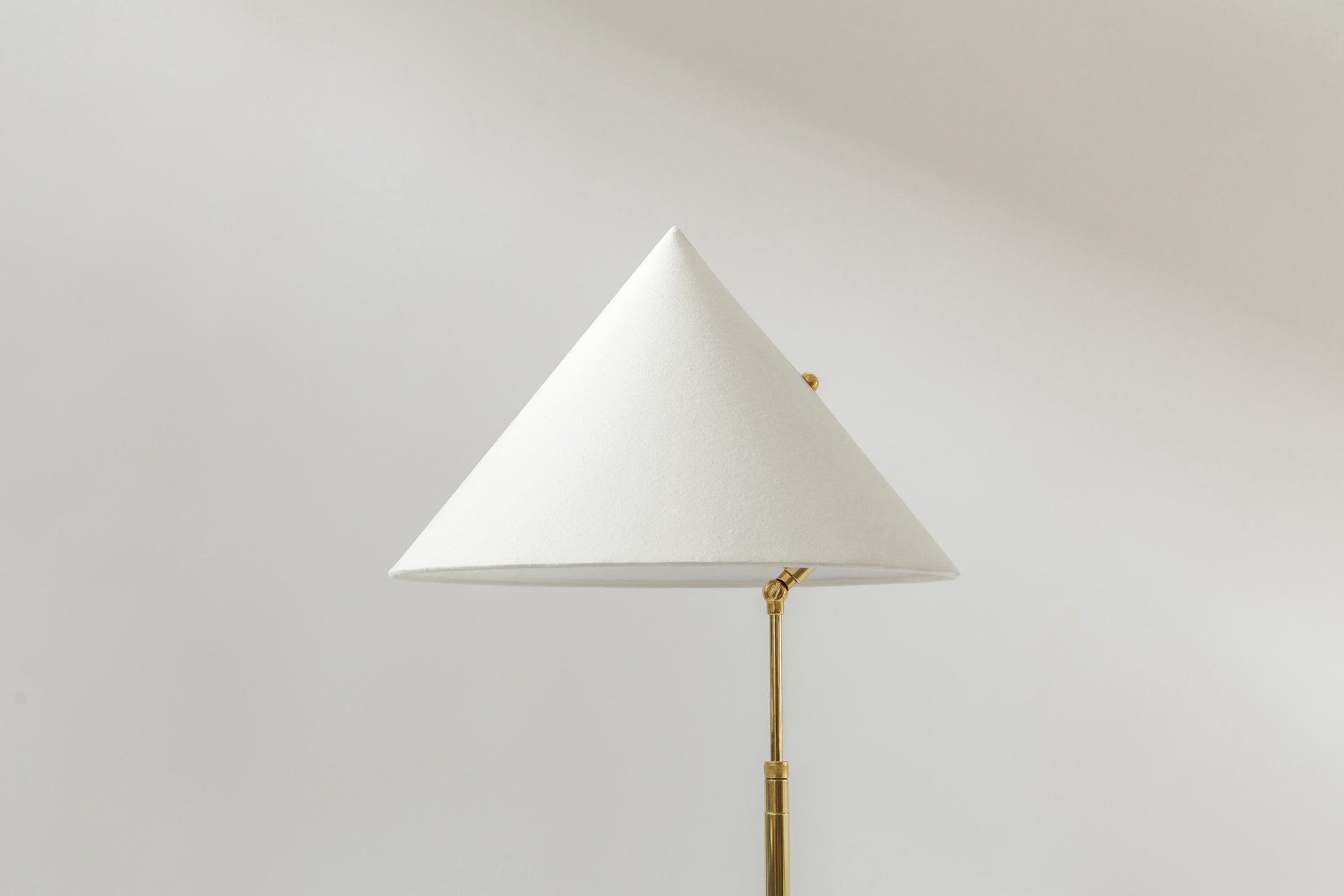 A classic geometric silhouette at a range of elevations. 16" linen shade. Telescoping brass armature set asymmetrically into a custom hand cast concrete base. Dimmable.